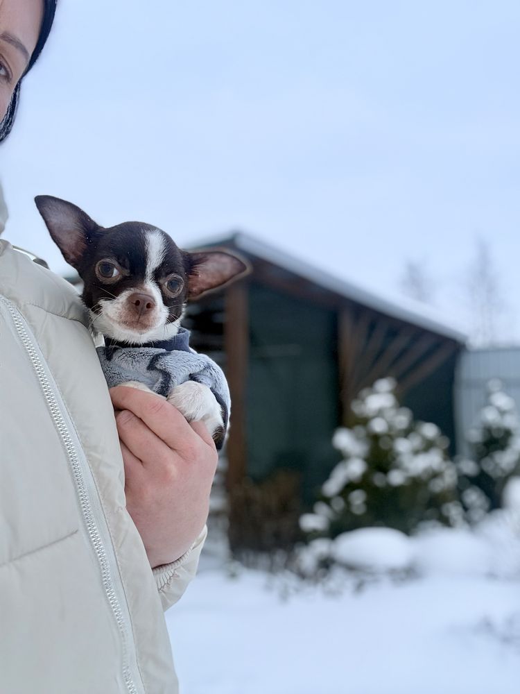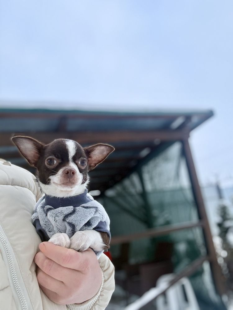 Пропонується до продажу неймовірна красуня породи Чихуахуа у вишуканому кольорі гіркий шоколад із білим. Це породна дівчинка з бездоганною статурою та справжнім характером справжнього аристократа.