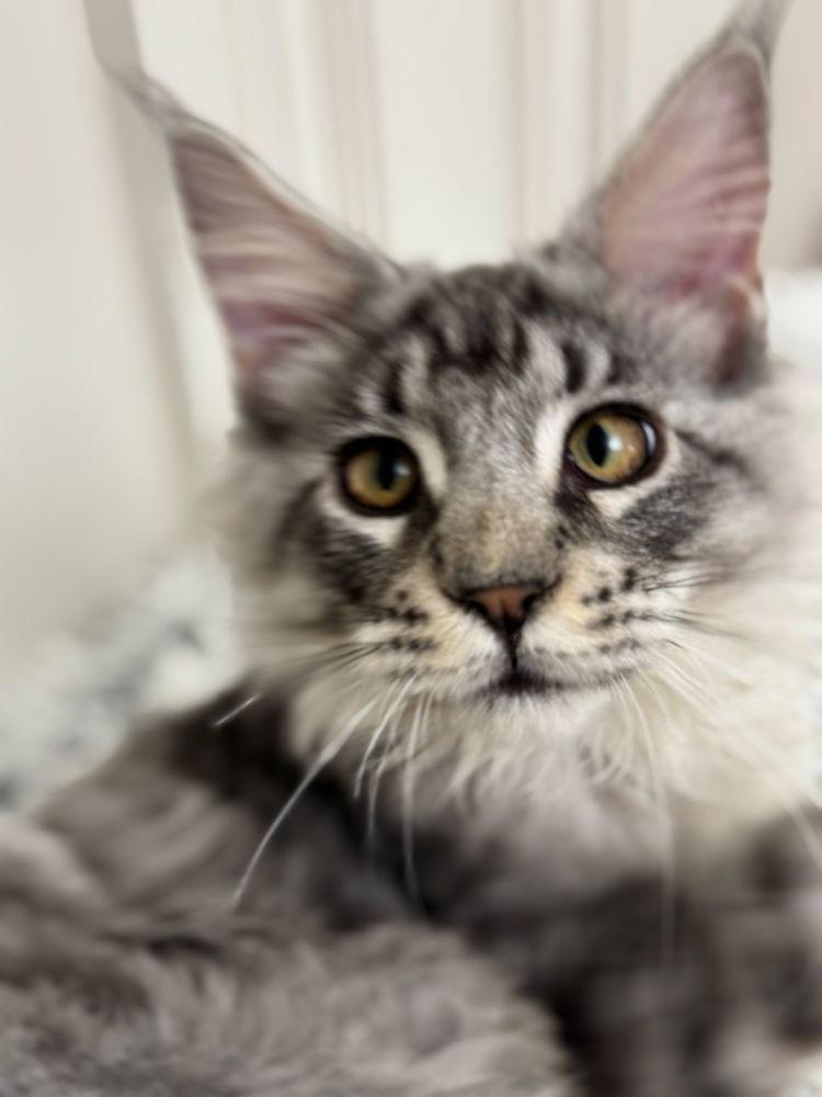 Мейн-куни відомі своїм великим розміром і характером «кішка-собака»: вони розумні, дружелюбні, прекрасно уживаються з дітьми та іншими тваринами. Цей хлопчик — не виняток. Він ласкавий, любить спілкування, але водночас буде справжнім захисником дому.