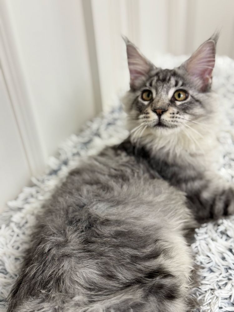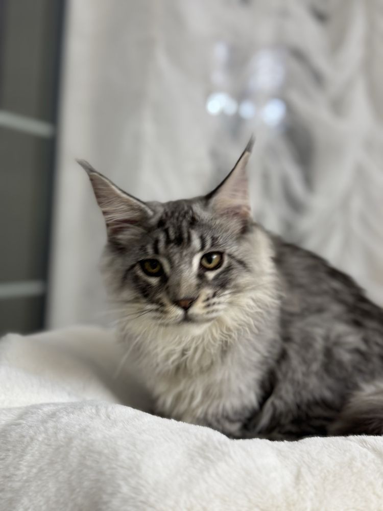 Його срібляста шерсть блищить і переливається, підкреслюючи міць і красу породи. Голова правильної форми, широкий лоб, виразний погляд — справжній представник «дикого» типу мейн-кунів.