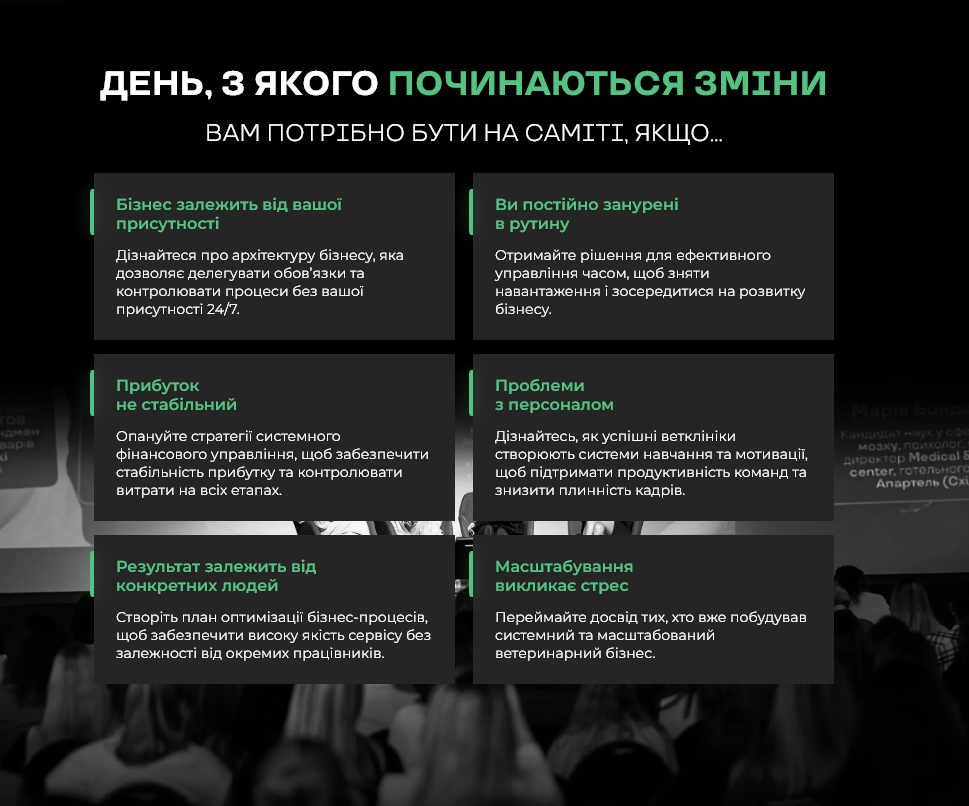 Всеукраїнський ветеринарний саміт — це масштабний галузевий захід для власників, керівників і топменеджерів ветеринарних клінік, зоомагазинів та суміжного зообізнесу, які хочуть побудувати керовану, стабільну та масштабовану бізнес-систему.